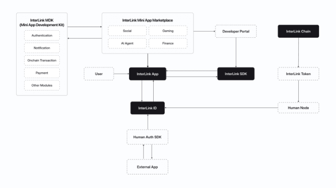 개발자는 인증, 알림, 온체인 거래, 결제 등의 기본 모듈을 제공하는 인터링크 MDK(미니 앱 개발 키트)를 사용하여 이러한 앱을 개발합니다. 앱은 개발자 포털을 통해 배포 및 관리되며, 인터링크 SDK를 통해 네트워크와 상호 작용합니다.
